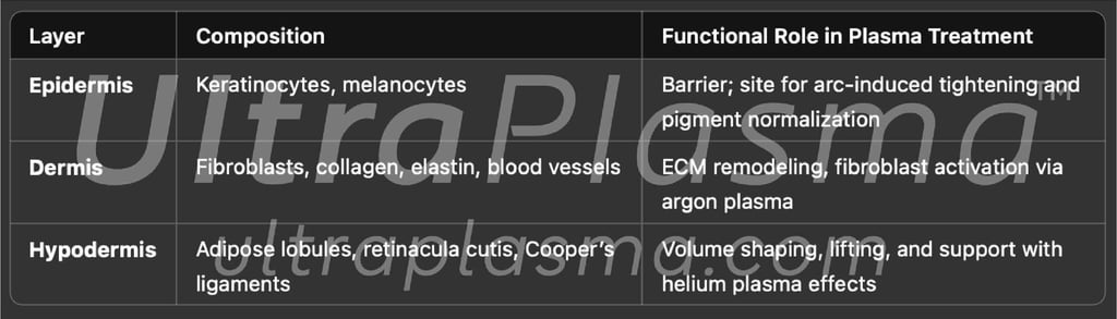 Understanding the spatial relationship between skin, fat, ligaments, and fascia allows precise targeting of plasma penetration zones based on energy and gas type.