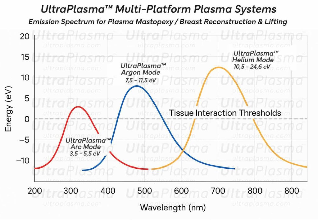 The demand for non-invasive and minimally invasive procedures in breast reconstruction, contouring, and lifting has led to the development of novel energy-based technologies. This article presents an in-depth academic, anatomical, and engineering-based analysis of UltraPlasma™, a multi-platform system integrating arc, argon, and helium plasma modalities. Each plasma type offers distinct energy profiles and gas-phase interactions tailored to the epidermis, dermis, and hypodermis. Particular emphasis is placed on plasma mastopexy, a non-surgical breast lifting technique utilizing controlled subdermal contraction and collagen remodeling. The biological effects of ozone (O₃), nitric oxide (NO), and reactive oxygen and nitrogen species (RONS) are explored in relation to skin tightening, angiogenesis, and extracellular matrix regeneration. By employing energy- and gas-specific interactions with soft tissue layers, UltraPlasma™ enables gradual, scar-free improvement in breast contour, volume support, and dermal integrity. This multi-layered plasma approach offers a paradigm shift in aesthetic and reconstructive breast procedures, bridging engineering precision with regenerative medicine.