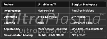 UltraPlasma™ offers a novel, non-invasive, and bio-regenerative alternative for breast reconstruction, contouring, and especially mastopexy. By engaging the anatomical architecture of the skin and leveraging gas-mediated molecular cascades, this platform provides individualized, safe, and effective enhancement—representing a paradigm shift in aesthetic breast medicine.