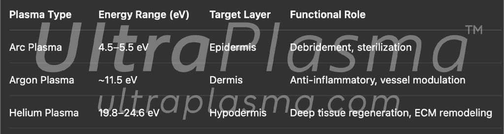 • Arc plasma (4.5–5.5 eV) delivers focused superficial energy, ideal for epidermal interaction.