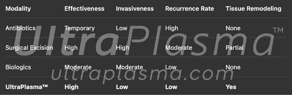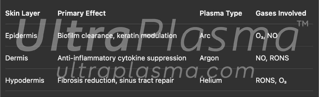 The UltraPlasma™ approach is fundamentally distinct in its ability to selectively target skin layers—epidermis, dermis, and hypodermis—through different plasma types (arc, argon, and helium) while delivering biochemically active gases such as ozone (O₃), nitric oxide (NO), and reactive oxygen/nitrogen species (RONS). This cross-sectional and gas-mediated specificity allows UltraPlasma™ not only to eliminate surface pathogens and biofilms but also to modulate inflammation, restore vascular function, and remodel subdermal fibrotic tissues that are hallmarks of advanced HS.
