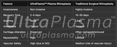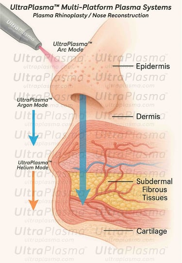UltraPlasma™ rhinoplasty represents a revolutionary, minimally invasive technique for reshaping and lifting the nasal structure. Utilizing UltraPlasma™ multi-platform plasma systems, which integrate arc plasma, argon plasma, and helium plasma, this method offers precise energy delivery to superficial and deep nasal tissues. This article explores the underlying biophysics, skin and cartilage response, and gas-mediated biochemical pathways, with a special focus on ozone (O₃), nitric oxide (NO), and reactive oxygen/nitrogen species (RONS). A comparative analysis with conventional surgical techniques is also presented. Figures illustrate cross-sectional tissue effects, gas interactions, and histological changes.