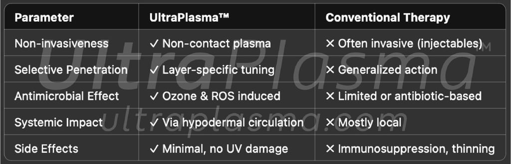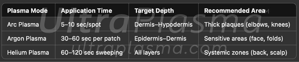 UltraPlasma™ stands at the frontier of dermatologic and immunomodulatory plasma treatment for psoriasis. By integrating arc, argon, and helium plasma technologies within a unified smart-controlled platform, UltraPlasma™ delivers both local symptom relief and systemic restoration. With its ability to interact with skin layers and biologically relevant gases like NO and ozone, it sets a new paradigm in personalized, non-invasive, multi-target therapy.
