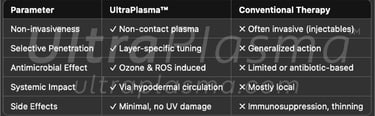 Psoriasis is a chronic autoimmune skin condition characterized by hyperproliferation of keratinocytes and inflammation, often resulting in red, scaly plaques. Traditional therapies (topical steroids, phototherapy, systemic immunosuppressants) present limitations in efficacy and safety. A novel approach has emerged with UltraPlasma™, an advanced multi-platform plasma system that integrates arc plasma, argon plasma, and helium plasma technologies, regulated via intelligent software and hardware output control.